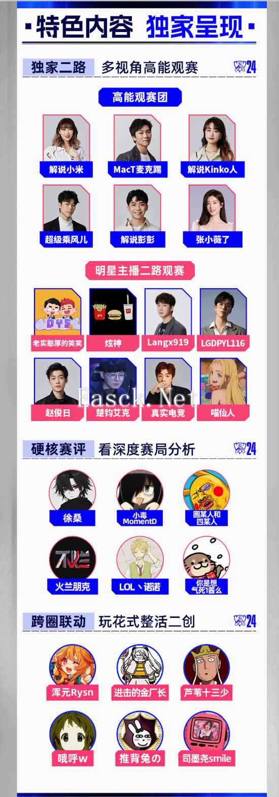 此外还有“独家二路”特色内容呈现,DYS笑笑限时返场,炫神、Langx919、赵俊日等明星解说天团也将亮相,敬请期待。