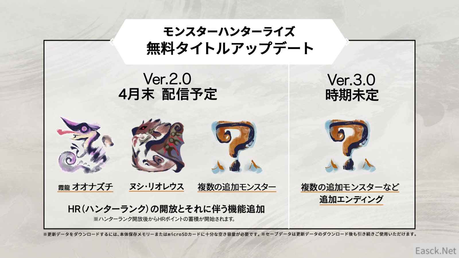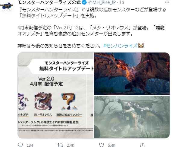 ·《怪物猎人:崛起》将于4月末免费更新V2.0版,包括霸主雄火龙、霞龙以及多种怪物确定登场,同时透露了V3.0版的信息,更多详情稍后公开,敬请期待。