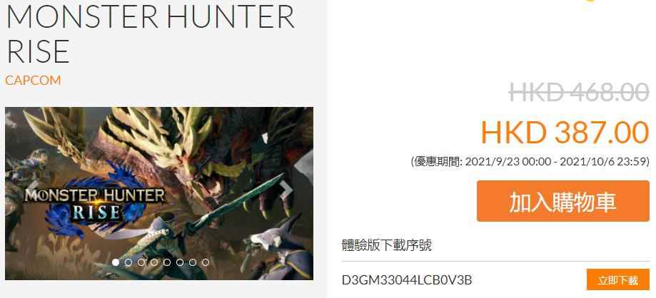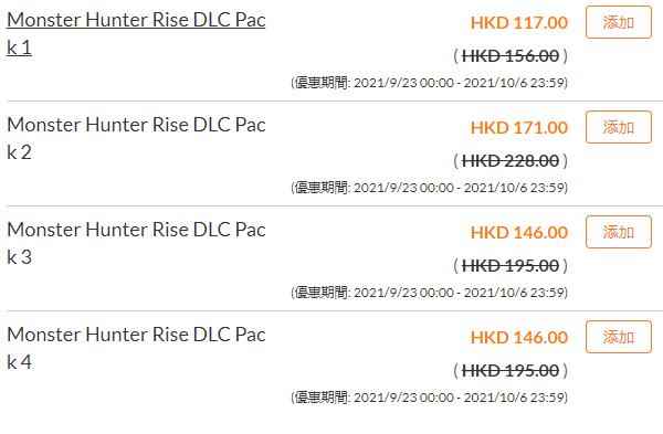 优惠详情《怪物猎人:崛起》本体原价468港币,折后价387港币 《怪物猎人:崛起》DLC包1原价156港币,折后价117港币 《怪物猎人:崛起》DLC包2原价228港币,折后价171港币 《怪物猎人:崛起》DLC包3原价195港币,折后价146港币 《怪物猎人:崛起》DLC包4原价195港币,折后价146港币