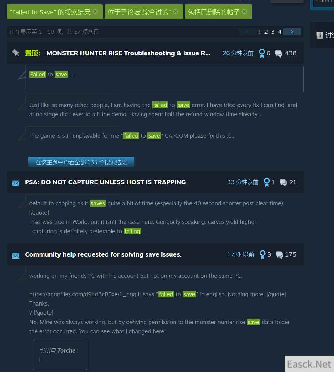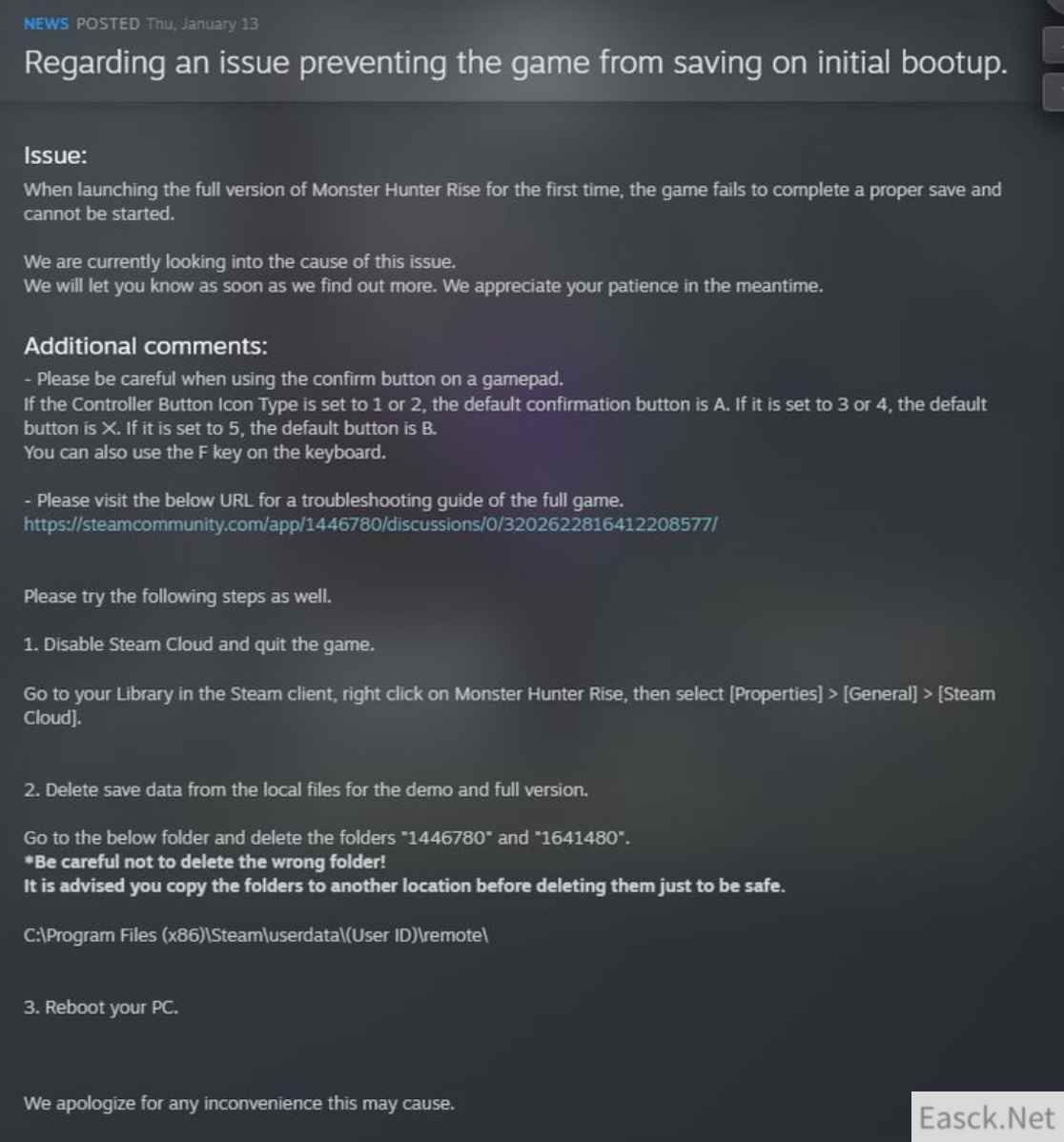 《怪物猎人:崛起》玩家可以安装游戏并像往常一样启动游戏,但当接受一个提示,上面写着“没有保存数据存在,要创建一个新的存档吗?”,这时一个错误就出现了,上面写着“保存失败(Failed to Save)”,导致玩家无法继续游戏。如果不能创建一个存档,《怪物猎人:崛起》就无法开始。换言之,《怪物猎人:崛起》PC玩家无法进入他们购买的这个游戏。 《怪物猎人:崛起》Steam讨论页面上有一个帖子,显示该问题被很多玩家碰到。有超过850个评论讨论这个错误。遗憾的是,没有一个讨论者给出了解决办法。大部分人只是确认自己遇到了“保存失败”错误,希望Capcom能尽快修复。 一名用户晒出了V社官方发来的邮件。邮件要求用户创建并给V社发送一个日志,详细解释当错误发生时的情况。目前尚不清楚这封邮件的真实性。如果是的话,那么V社和Capcom官方都在调查这个问题。