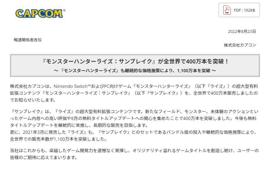 今日(8月23日),CAPCOM官方宣布公司发行的动作冒险游戏《怪物猎人:崛起》全球销量现已突破1100万份,其超大型付费DLC“曙光”销量突破400万份。
