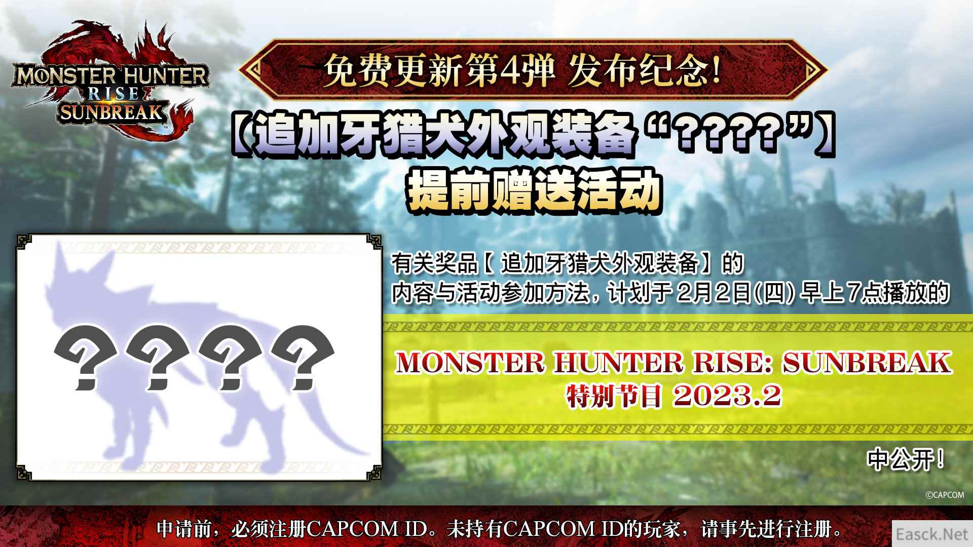 Capcom官博宣布《怪物猎人崛起:曙光》计划于北京时间2月2日早上7点播出特别节目,届时将公开“免费更新第4弹(Ver.14)”的信息和发售日,包含追加怪物、最新更新计划。还将介绍“追加牙猎犬外观装备????”的提前赠送活动!