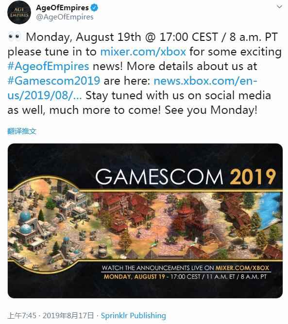 《帝国时代》官方推特预告了这一消息,并且告诉粉丝们准备好收看有关这个历史悠久的系列的“一些令人兴奋的新闻”。对于《帝国时代》,我们可以确定的是微软至少有两个游戏项目正在进行中,其中一个是《帝国时代2:决定版》,主要特色为重制的4K级视觉效果和音效,以及新增的“最后的可汗”战役。此前在分级通过后微软透露本游戏会在今年秋季窗口发售,那么明日很有可能就有确切日期的公开。