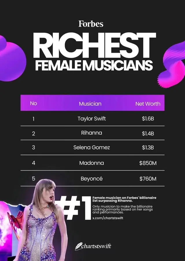 近日,福布斯全球富豪榜最新榜单发布,霉霉(泰勒·斯威夫特)成为全球最富有的女歌手,她的个人净资产已经飙升到了惊人的16亿美元(约合112亿人民币)!
