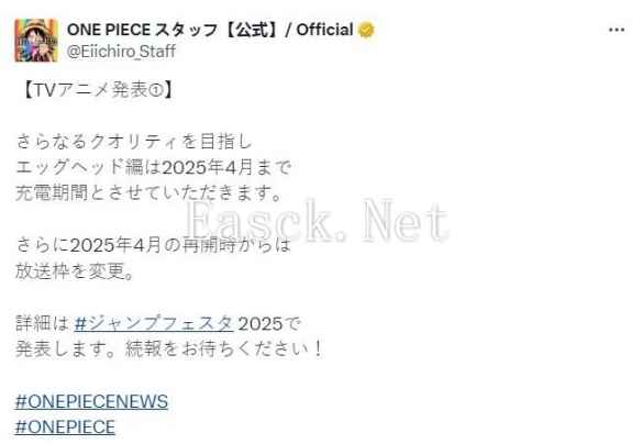 动画《海贼王》“蛋头岛篇”确定停播至2025年4月再开,官方表示播出时段将变更。更多详情将于12月JUMP FETSA2025公布。