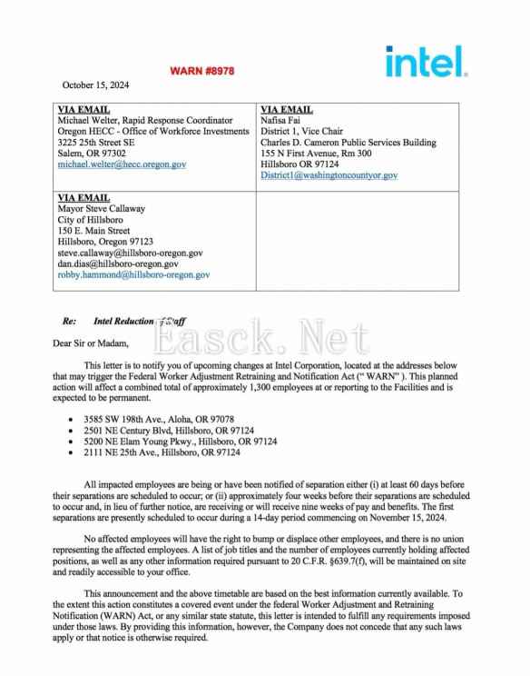 英特尔公司人力资源总监James Warner在联邦政府要求的通知中表示,所有受影响的员工都已经收到通知,或者将在裁员前至少两个月收到通知。“第一批裁员目前计划于2024年11月15日开始的14天内进行。”