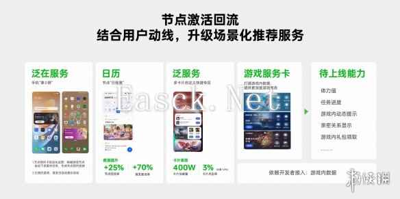 在老游运营上,OPPO 游戏联运已经进入老游运营3.0阶段,将全场景激活拆分为节点激活效率提升和长线稳活能力的探索。老游运营 3.0 主要利用全媒体通知能力和场景化推荐服务为更多老游实现续航升级。在全媒体通知能力上,OPPO 升级了短信和 push 这类强通知场景,如短信模块升级为沉浸式模板,且搭配一键启动游戏按钮,使模块整体点击率提升 10%;在场景化推荐服务上,OPPO 充分调动生态内丰富的场景,并结合用户的使用习惯与动线,提供丰富的浅场景游戏启动入口,如泛在服务卡片手机第0屏,基于用户已预约的节点做自动化的触达通知;日历,推出节点倒计时和上线提醒;负一屏快应用卡片,打造干人干面的游戏预约、更新、启动服务。