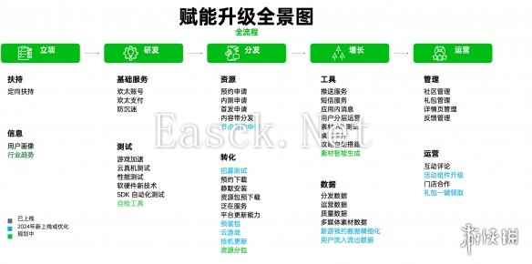 在赋能升级层面,OPPO 致力于从自助升级到数据透明,全方位助力游戏立项到运营。当前 OPPO 对游戏开发者的赋能能力已涵盖了全流程的各个阶段,包括立项、研发、分发、增长和运营。