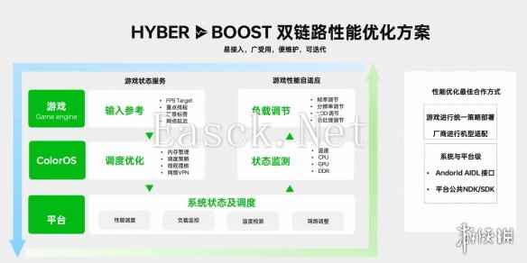 其中,HyberBoost双链路性能优化方案核心针对游戏性能提升,因芯片性能对画质以及负载需求的限制,游戏设计与实际体验之间存在卡顿掉帧、性能降低、发热烫手的矛盾。基于此,HyberBoost 从平台侧、系统侧、游戏侧提供游戏状态服务和游戏自适应性能服务,高效实现了手机和游戏的双向适配。此外,该方案摒弃了单独的厂商SDK,可让游戏通过安卓AIDL接口快速提供游戏内信息,便于OPPO为游戏定制化的调整手机性能供给及更多场景化的应用。游戏自适应性能服务则可让OPPO为游戏提供对应手机设备状态信息,便于游戏根据系统状态适度调节画质及帧率。