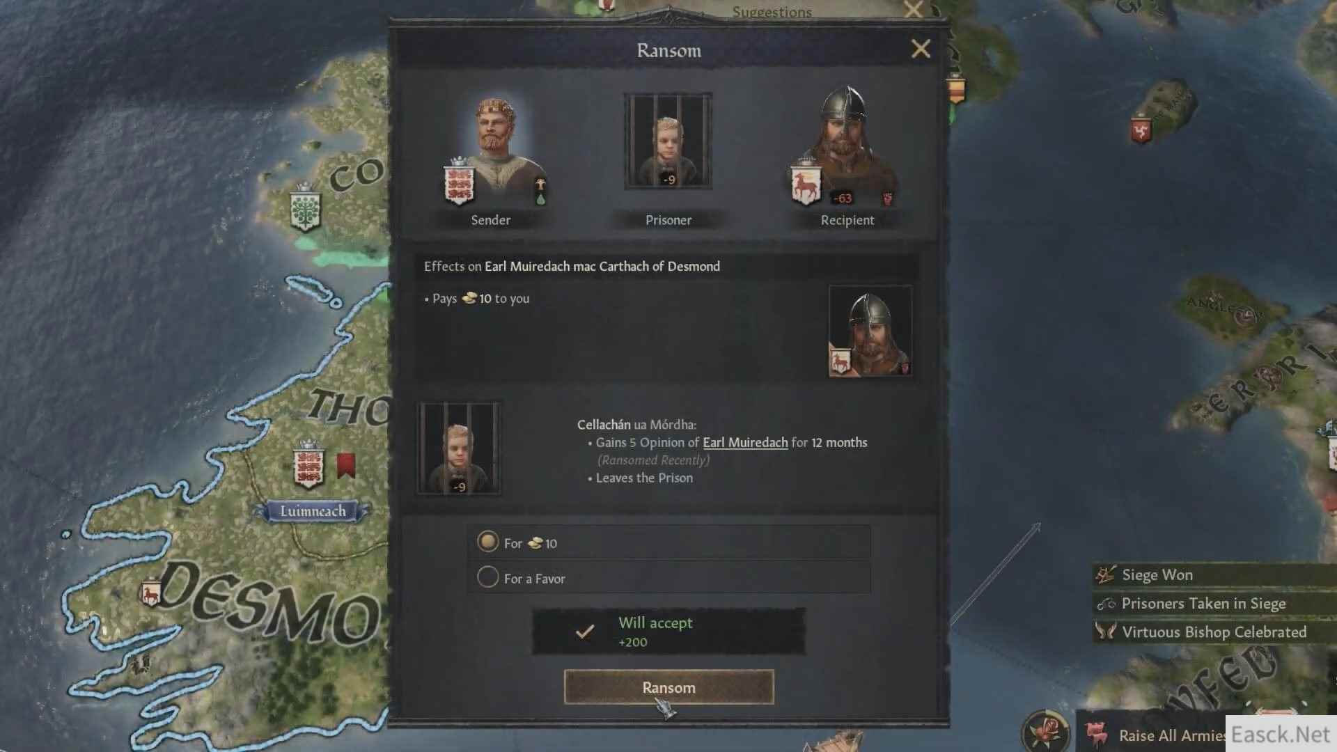 玩家在俘获敌方未成年的继承人后,可以选择关押,或者将其赎回给敌方,这样可以增加与敌方的好感度。也可以选择无条件的将俘虏送回,这样可以收获一个“HOOK”,这个类似人情的东西可以帮助你未来与其达成婚约之类的契约。根据玩家的宗教信仰,在十字军东征等宗教战争发生时,玩家可以选择是否加入。