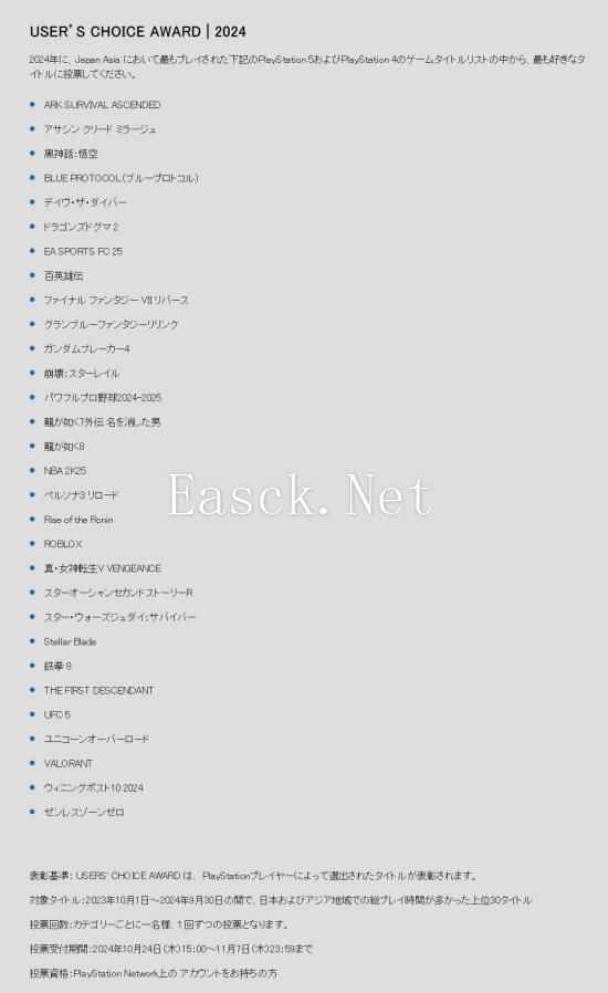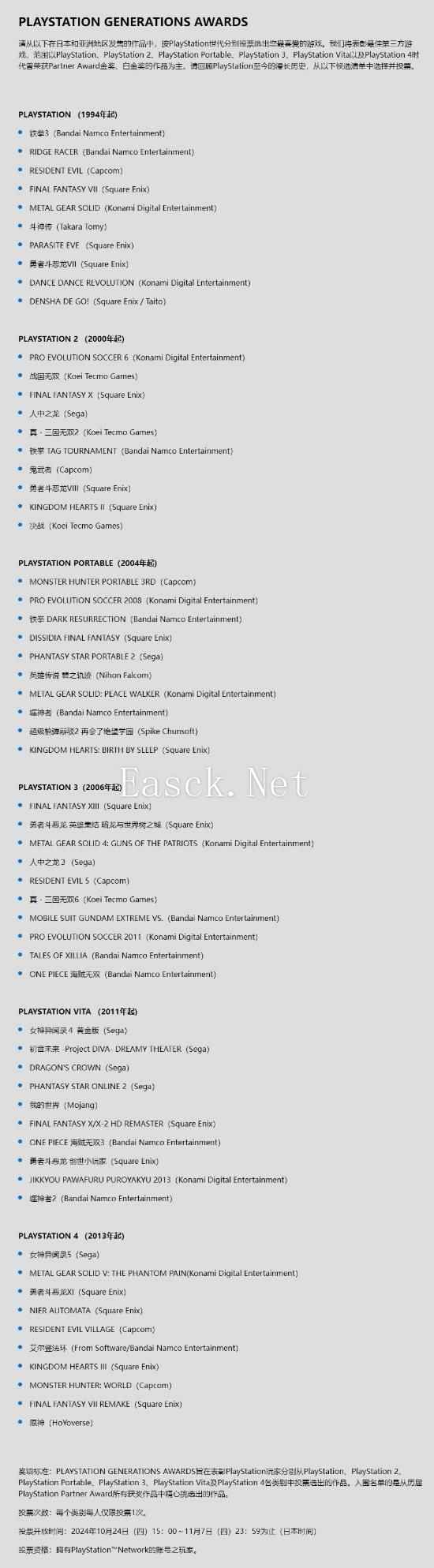 各个奖项如下: ·大奖(GRAND AWARD):2023 年 10 月~2024 年 9 月期间,由亚洲开发、全球销量排名前三的游戏;(去年由《最终幻想 16》《原神》及《生化危机 4 重制版》三款游戏拿下) ·合作伙伴奖(PARTNER AWARD):2023 年 10 月~2024 年 9 月期间,由亚洲开发、有过显著成果的游戏; ·优秀卓越奖(EXCELLENCE AWARD):连续三年获得 GRAND AWARD 大奖的游戏; ·特别奖(SPECIAL AWARD):2023 年 10 月~2024 年 9 月期间,由亚洲开发,取得过显著成果的游戏; ·用户选择奖(USERS’CHOICE AWARD):2023 年 10 月~2024 年 9 月期间,日本和亚洲玩家游戏时间最长的前 30 款游戏中,由玩家投票选出的前 5 名,截止时间为 11 月 7 日。 此外,为庆祝 PlayStation30 周年,索尼还宣布将设立新的“PS 世代奖”,将从 PS1~PS4 每一世代的获奖作品中选出各 10 款作品让玩家投票,选出最优秀的作品进行表彰,截止时间同样为 11 月 7 日。
