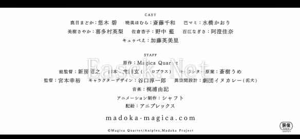 原作:Magica Quartet 总导演:新房昭之 剧本:虚渊玄(ニトロプラス) 角色原案:苍树うめ 导演:宫本幸裕 角色设计:谷口淳一郎 异空间设计:剧団イヌカレ―(泥犬) 音乐:梶浦由记 动画制作:SHAFT
