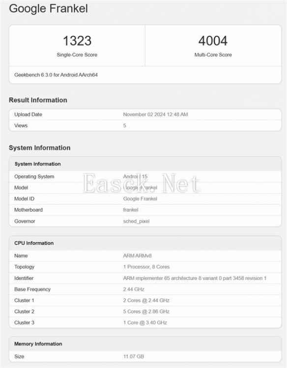 最近一款代号为“Google Frankel”的设备现身跑分网站Geekbench,这款设备搭载了谷歌自研芯片Tensor G5,单核成绩是1323,多核成绩是4004。