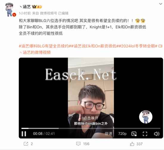 LPL知名经纪人涵艺带来S14亚军BLG的最新爆料,全员续约有望。