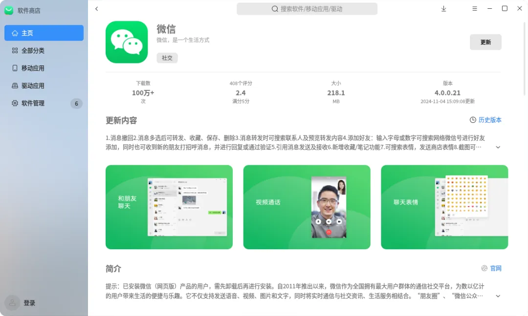 目前,最新的微信Linux 4.0.0版本已上线各操作系统应用商店,功能模块与Windows、Mac 4.0公测版对齐,实现了跨平台统一体验。