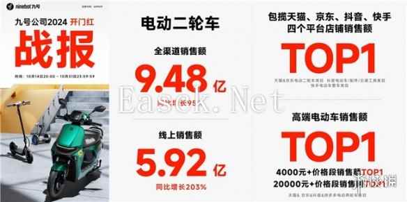 九号公司正式公布双十一开门红战报——实现自营全渠道销售额超9.85亿元,同比增长92%,其中线上销售额超6.16亿元,同比增长189%。且首度入驻快手电商直播,便实现单日销售额超1012万元,排名行业第一,旗下九号电动天猫直播间,成为本轮开门红期间行业首个店播破亿的品牌,实现持续领跑。