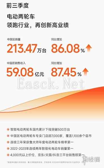 并且九号电动两轮车业务于前三季度实现实现国内销量213.47万台,同比增长86.08%,中国区销售收入59.08亿元,同比增长87.45%。报告期内,九号公司电动两轮车继6月底完成400万台出货量突破后,仅3个月时间,第500万台智能电动两轮车也已下线,成为电动两轮车行业最快突破500万台国内累计出货量的品牌。