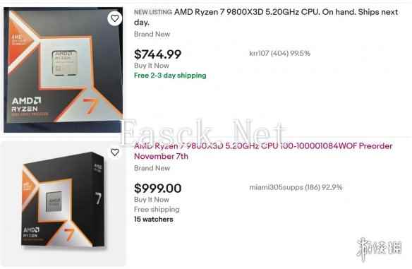 根据外媒报道称,锐龙7 9800X3D在亚马逊和新蛋等消费平台都已售罄,首发479美元的高价,依然无法挡住消费者的抢购热情。这可为黄牛提供了一个好的战场!因为需求太过火爆,黄牛们加入这个行列,在其他平台,能够购买到锐龙7 9800X3D,却有着1000美元的天价,价格直线上涨。