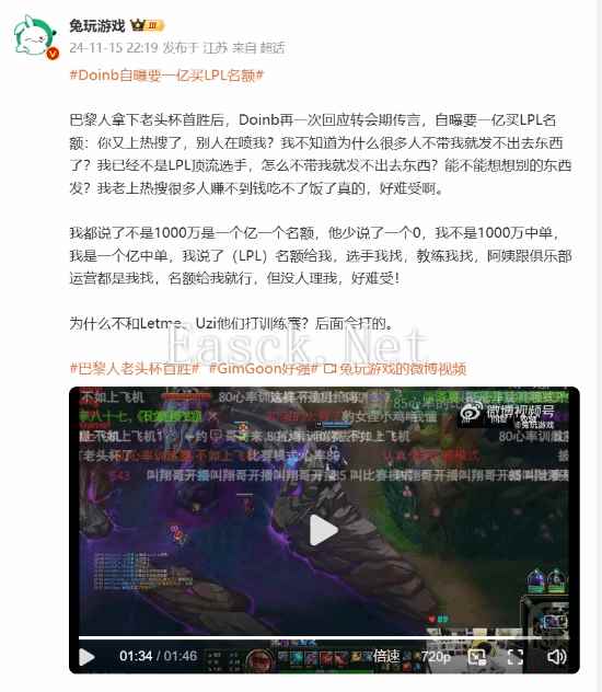 据兔玩游戏消息,在巴黎人拿下老头杯首胜后,Doinb再一次回应转会期传言,自曝要一亿买LPL名额。