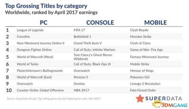 《绝地求生:大逃杀》从3月24日开售,在抢先体验阶段就已经吸引了大量的玩家购入该作,突破了Steam Early Access收费游戏的销售记录。 ![]() 《绝地求生:大逃杀》在4月10日的销量就已经超过了百万套,5月2日更是越过了200万套大关,势不可挡。 此外,SuperData还统计道,电子游戏市场比去年有了9%,77亿美元的增长,移动游戏增长了8%,F2PMMO增长了27%。