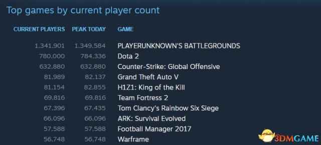 据Steam官方数据,《绝地求生》是游玩人数最多的游戏,最高曾达到134万9584人,比之前报道的还要高一些。V社自家游戏《DOTA2》排名第二,但距离第一名《绝地求生》,游玩人数已经拉开了一个档次。第三名则是《CS:GO》。 再往后的排名游戏,在线人数已经和前三甲根本不是一个量级的,都没有超过10万人,它们是:《GTA5》、《H1Z1》,《军团要塞2》、《彩虹六号:围攻》、《方舟:生存进化》、《足球经理2017》和《星际战甲》。 《彩虹六号:围攻》作为2015年底发售的老游戏,至今还能入围Top 10也是不容易了,尽管在线人数只有几万人。