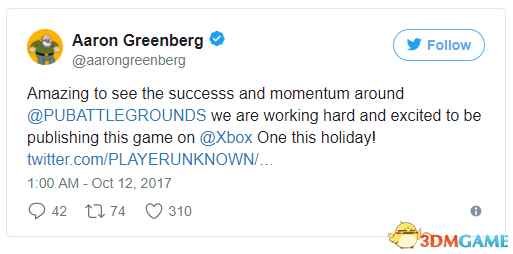 蓝洞和微软在今年早些时候计划在今年后期某段时间推出Xbox版《绝地求生》,如果真是这样可能正式版来的还会比Steam还要早。 根据《绝地求生:大逃杀》的市场总监Aaron Greenberg,这个计划仍然成立。他最近发了一条推特,向庆祝Brendan Greene游戏最高在线人数超过200万,附带了一句话: “我们正在努力工作,并且非常激动的宣布Xbox版的游戏会在圣诞节假期前与大家见面!”
