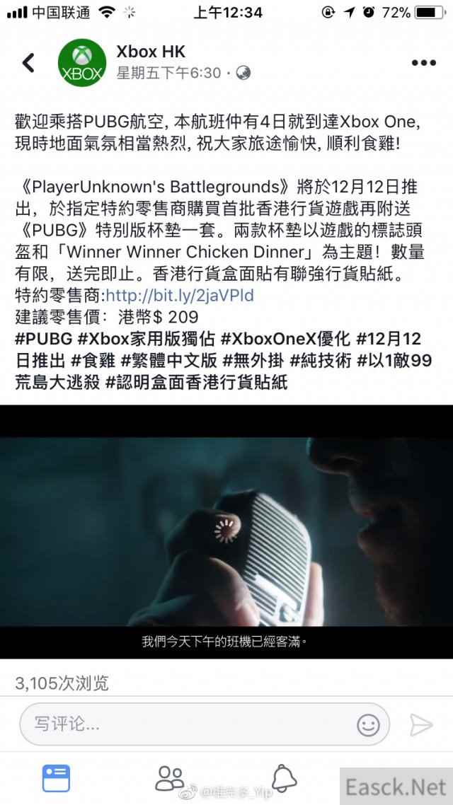 《绝地求生》将于12月12日发售登陆Xbox One游戏预览,最近Xbox香港官方FB公布了港版Xbox One版《绝地求生》的实体版零售价:209港币,约合人民币177元。
