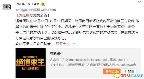 今日《绝地求生:大逃杀(PlayerUnknown’s Battlegrounds)》官博发布了最新一周的外挂报告。内容显示,在过去一周的时间内(12月11日-17日),有294791个账号因为使用外挂被处罚。比起上周宣布封号123,921个,本周公布的将近30万的账号数量更加的触目惊心。