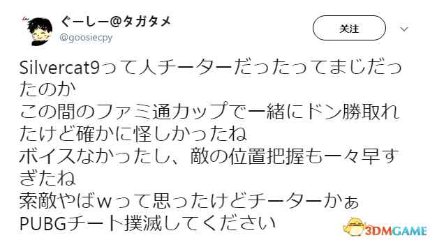 目前,SilverCat9的推特账号已经注销、Steam上也改了名字,消失得无影无踪。日媒颇以此为耻,“比赛在Twitch这个外国观众很多的平台上直播,现在全世界的玩家都知道日本活跃着一个外挂选手了。” 看来,被“吃鸡”外挂事件刷屏的不止我们一国。 |