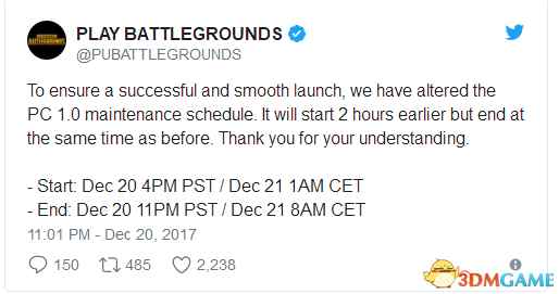 对于《绝地求生(PUBG)》玩家来说,今天是个大日子。在太平洋时间20日晚11点,北京时间今天下午15点,PUBG v1.0正式版将登陆。 按照PUBG官方推特的说法,吃鸡服务器将从北京时间上午8点开始维护,直到15点重新开启,届时全新的1.0版就将正式到来。