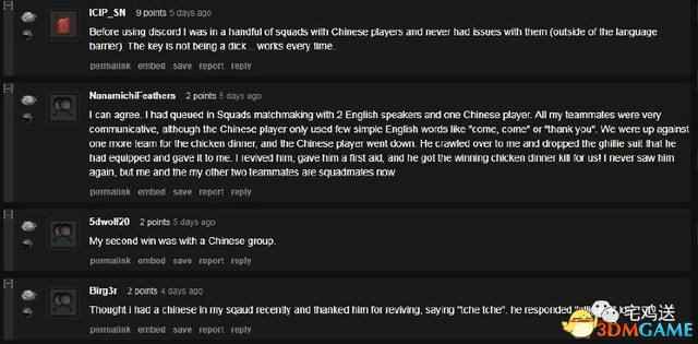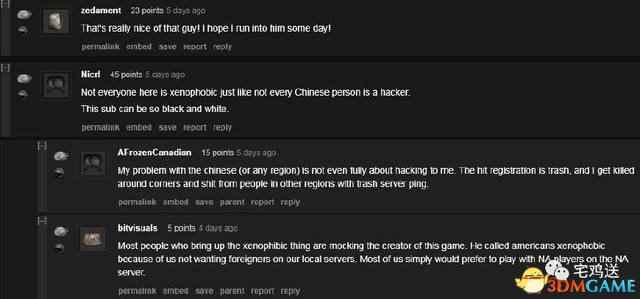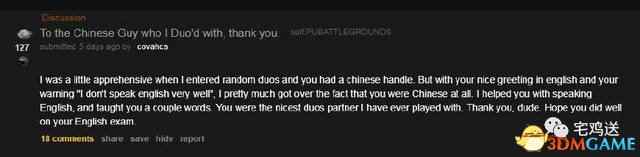 这位老外说道:当我刚进入游戏发现你是个中国人,我还是有点担心的。但当你用英文礼貌的跟我打招呼并且为自己的英文不好而向我道歉,我几乎忘了你是中国人的事实。我帮助你说英语教并且了你一些单词。你是我遇到的最好的双排队友,谢谢你,祝你在英语考试中取得好成绩~ ![]() 评论中有老外表示自己也想排到这么好的队友,并且希望能有一天也能匹配到他。还有一位理智的老外说不是每个中国人都是排外的,就像不是每个中国人都是作弊者一样,这个论坛里非黑即白论的人还是太多了。还有外国网友表示他对于中国玩家的成见不在于中国玩家经常开挂或是非法组队,因为中国玩家存在后带来的延迟补偿机制,他经常会莫名其妙的死。 ![]() 也有外国网友说出了自己遇到中国人的一次经历,表示尽管他只会使用一些简单的英语单词,比如“come,come”或是“thank you”。在我们吃鸡前他倒下了,他爬到我面前还把吉利服交给了我,我把他救了起来,最后他带我们赢得了胜利,吃到了鸡。 ![]() 其实Reddit上还是就事论事居多,他们还是持有比较中立的态度,甚至还有些外国人喜欢和中国人一起玩游戏,并没有像我们想的那样仇视我们。对于那些开挂者,我们普通玩家是一样痛恨的,所以大家做好自己就好。 |