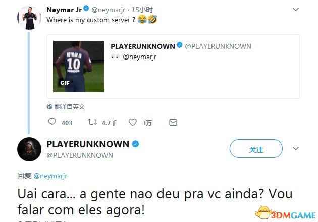 内马尔发推催蓝洞 于是暴脾气你马哥坐不住了,《绝地求生》制作人昨天又和内马尔发推互动,马哥借机再次追问PUBG官方,“我的自定义服务器呢?”而PUBG也在打太极,“啥?他们还没给你弄好?我马上给你催一下!”不知道这一场大咖VS吃鸡的戏码什么时候会有个结果,内马尔拿到服务器之后又要搞什么,要干直播当副业?