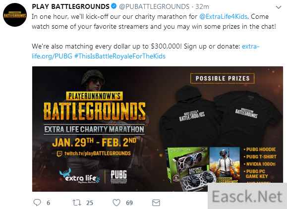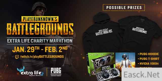 《绝地求生》慈善赛直播活动会在1月29日-2月2日进行,直播地址为Twitch.tv/playBATTLEGROUNDS。