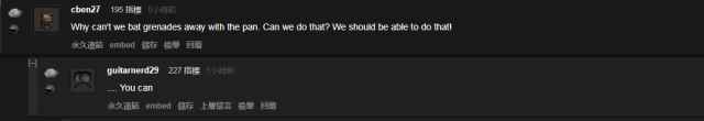 玩家cben27评论:“为什么我们不能用平底锅像棒球那样把手雷打走。我们能做到那样吗?我们应该可以那样!” 玩家guitamerd29回复说:...你可以。 你们在游戏中用平底锅敲飞过手雷吗?请在下面发表你们的看法。 |