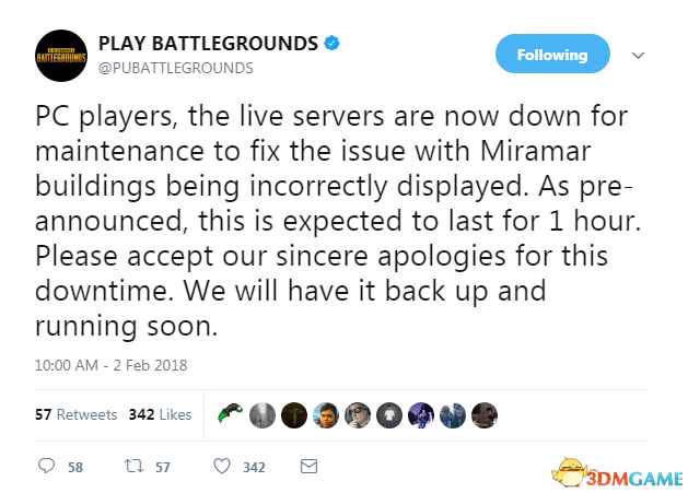 译文:PC玩家们,服务器现在关闭维护,修复Miramar建筑错误显示问题。预先通知一下,这次维护预计进行一个小时。请为这次停机接受我们真挚的道歉。我们会尽快搞好。 根据以往的经验,这次《绝地求生》1小时内不一定能维护完成,通常要延续1-2个小时。请在下面发表你们的看法。 |