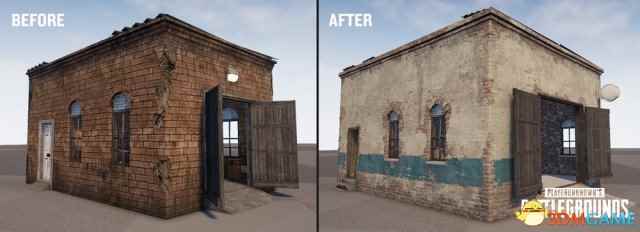 游戏中房屋的新外观,右为调整后 新地图会首先在《绝地求生:大逃杀》的测试服中投放,蓝洞将会借此收集一系列玩家的反馈,从而对这张地图进行必要的调整。开发团队表示,在新的地图中,玩家将更需要“看脸”,每场比赛的节奏也会加快。