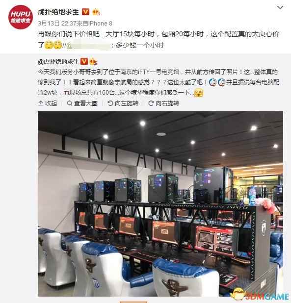 @虎扑绝地求生还在电竞馆开业前夕前往探班,里面的电脑每台配置2万元,一共160台,非常之壕了,至于价格,@虎扑绝地求生爆料,大厅15元/时,包厢20元/时,考虑到配置和环境,你觉得如何?