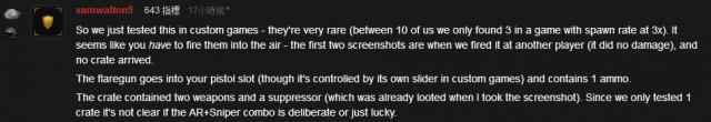 Sam Walton9表示,自己只是在自定义游戏中测试了这件武器,它非常罕见(他们10个人只在3局比赛中发现过3把)。这把信号枪中有一发弹药,射向空中可以召唤一个小型空投,里面装着两件武器和一件抑制器。