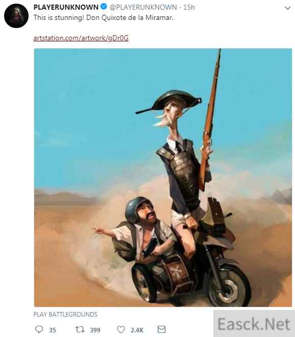 《绝地求生》制作人PLAYERUNKNOWN布伦丹格林日前分享了一张游戏插画,相信看过《唐吉坷德》小说和动画的玩家一定很熟悉这个场景,唐吉坷德骑士和他的跟班桑丘出现在《绝地求生》世界了,马匹和毛驴换成了摩托,头盔换成了平底锅,2人无畏险阻,勇往直前。这幅插画出自俄罗斯艺术家Vladimir Malakhovskiy之手。 推特信息 布伦丹格林:这太棒了!堂吉诃德·台·拉·曼却