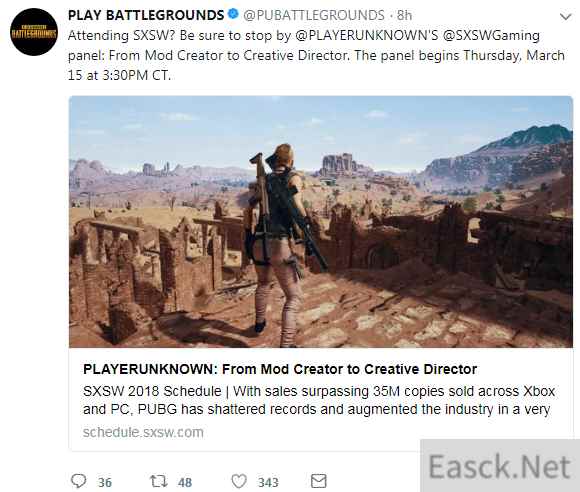 译文:有参加SXSW的朋友吗?请务必看看《绝地求生》活动:从一名Mod作者到创意总监。活动会在美国中部时间3月15日下午3:30开始。 现场发言人:《绝地求生》团队 布伦丹格林 ,Rooster Teeth 艾斯利詹金斯