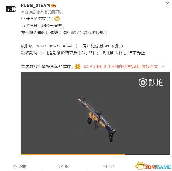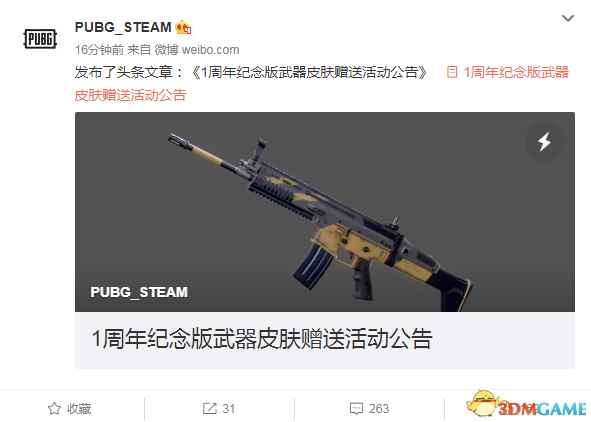 《绝地求生》Steam官方微博“PUBG_STEAM”不久前发布了头条文章,公布了《绝地求生》1周年纪念版武器皮肤赠送活动,玩家登陆游戏即可获得1周年纪念版Scar-L皮肤,如上图所示。 官方微博:
