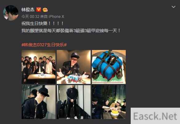 林俊杰晒绝地求生蛋糕 生日许愿每天3级头3级甲