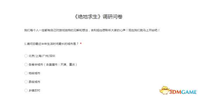 腾讯不久前发布了一篇关于《绝地求生》PC版的调查问卷,问玩家如果推出一款低配置版《绝地求生》,大家是否愿意尝试?腾讯称低配置版《绝地求生》会保持游戏的玩法和内容不变,适当降低部分游戏画质和美术表现,从而适应更多电脑。 调查问卷地址点此 调查问卷截图: