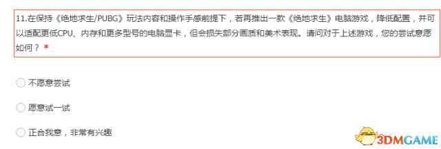 调查问卷第11题原文:在保持《绝地求生/PUBG》玩法内容和操作手感前提下,若再推出一款《绝地求生》电脑游戏,降低配置,并可以适配更低CPU、内存和更多型号的电脑显卡,但会损失部分画质和美术表现。请问对于上述游戏,您的尝试意愿如何? |