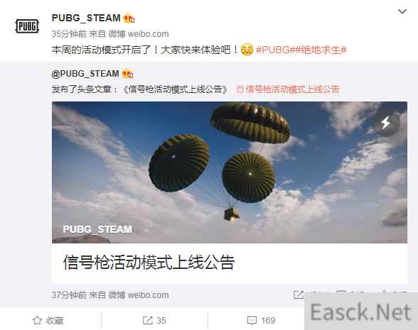 《绝地求生》Steam官方微博不久前公布本周信号枪活动模式上线了,玩家可以在游戏中搜索数量不多的信号枪,垂直朝空中发射信号获得空投补给,高度要求达到200米,这也是第二个活动模式内容。 本次活动在3月30日上午10点开始,4月2日上午10点结束。