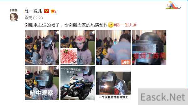 刚看到陈一发戴的这个三级头,网友就觉得哪里不对,跟游戏中的三级头有些不太像,却非常像电焊工所用的防护用品。为此,有调皮粉丝就把陈一发戴三级头的样子给加工一下,让陈一发变成了一个没有感情的电焊工……