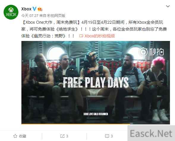 微博原文:【Xbox One大作,周末免费玩】4月19日至4月22日期间,所有Xbox金会员玩家,将可免费体验《绝地求生》!!!这个周末,各位金会员玩家也别忘了免费体验《幽灵行动:荒野》!! 视频如下: