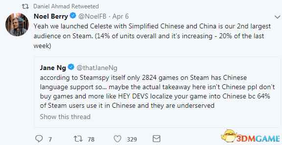 日前《看火人》艺术总监Jane Ng查看了Steam Spy 2017 GDC报告,并针对报告中的描述很好奇,目前中国Steam玩家除了《绝地求生》外,基本不买其他游戏,Steam中国本土化的游戏不多,那么到底有多少游戏支持简体中文的呢? 随后Jane Ng进一步回答,根据Steam Spy数据来看,Steam上只有2824款游戏支持简体中文,实际上不是因为中国玩家不买游戏,很多开发商也知道64%的Steam用户都用中文,他们也推出简体中文,但是Steam对中国玩家服务很差(中文翻译质量低下),这才是很多玩家不买游戏的原因。 《蔚蓝》开发人员Noel Berry回复Jane Ng说他们的《蔚蓝》就支持简体中文,中国玩家已是他们在Steam的第二大玩家群体(占总销量的14%,上周增长到20%)。