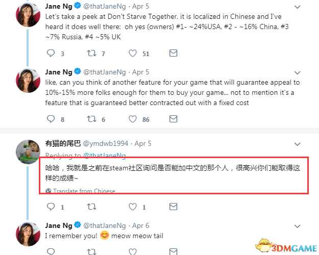 其中一名中国玩家“有猫的尾巴”也回复说:哈哈,我就是之前在Steam社区询问能否加入中文的那个人,很高兴你们能取得这样的成绩。 Jane Ng回复说:我记得你!猫尾巴。 由此可见国外开发商非常重视Steam中国玩家群体,如果提升中文质量,势必会吸引更多玩家购买游戏。 |