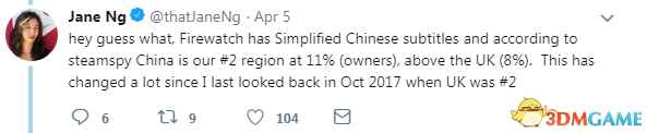 Jane Ng继续说:你们能猜到吗?《看火人》带简体中文字幕,据Steamspy统计,中国是我们第二大消费群体(玩家占总量的11%),超过英国的8%。去年10月,英国还是第二名,变化很大。